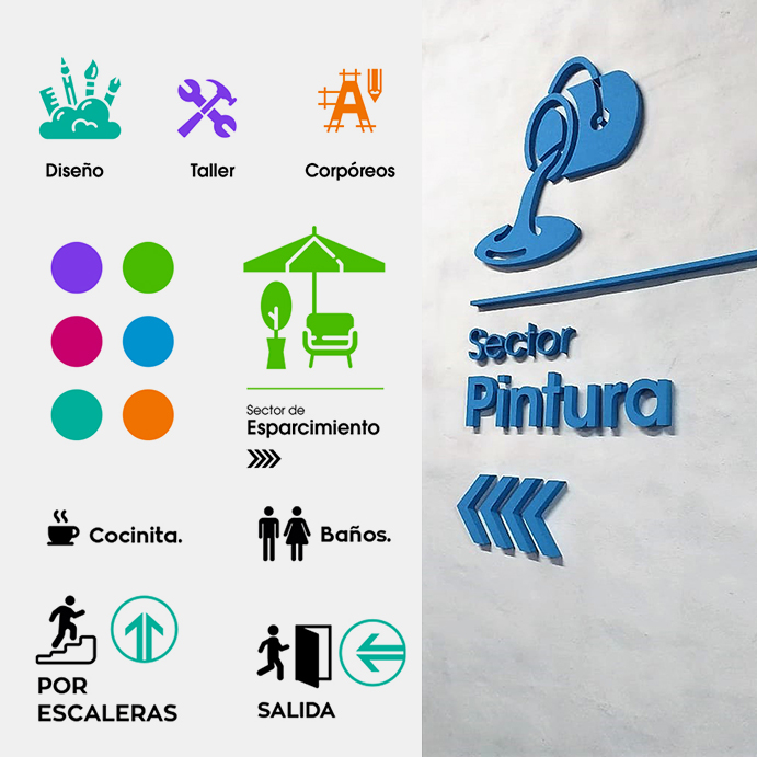 Identidad corporativa, generación de elementos principales (color - morfología - tipografía - íconografía). Estrategia conceptual de zonificación. Nomenclaturas. Diseño de señalética en diversos canales sensoriales, según normas IRAM, ISO y criterios de desarrollo. Interiores o exteriores.
